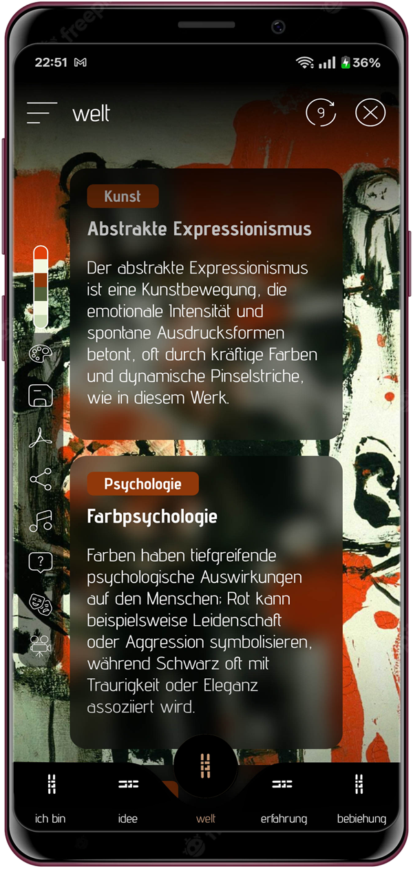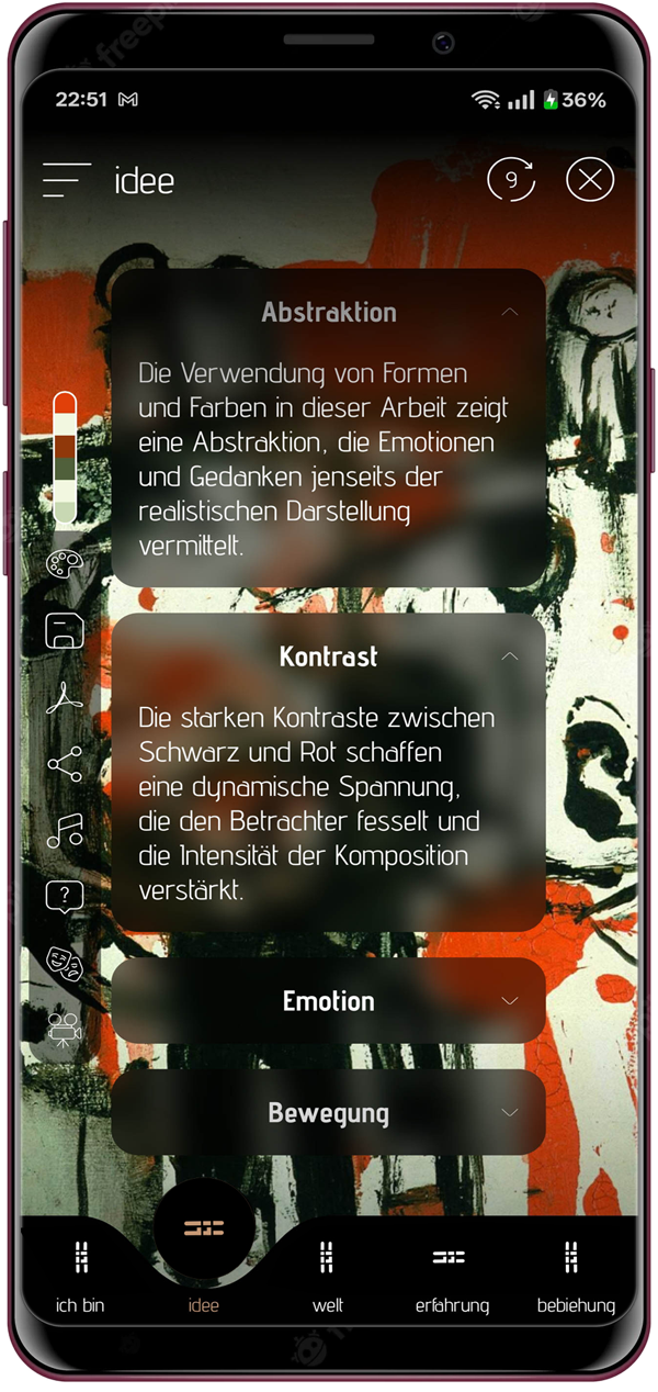 Die Anwendung Nema nutzt künstliche Intelligenz, um das Bild über seine äußere Erscheinung hinaus zu „lesen“. Sie identifiziert dominante Farben, emotionale Stimmungen, symbolische Elemente und zugrunde liegende Konzepte. Das Kunstwerk wird zu einer Karte voller Bedeutungen — ganz ohne Kunstgeschichtestudium.