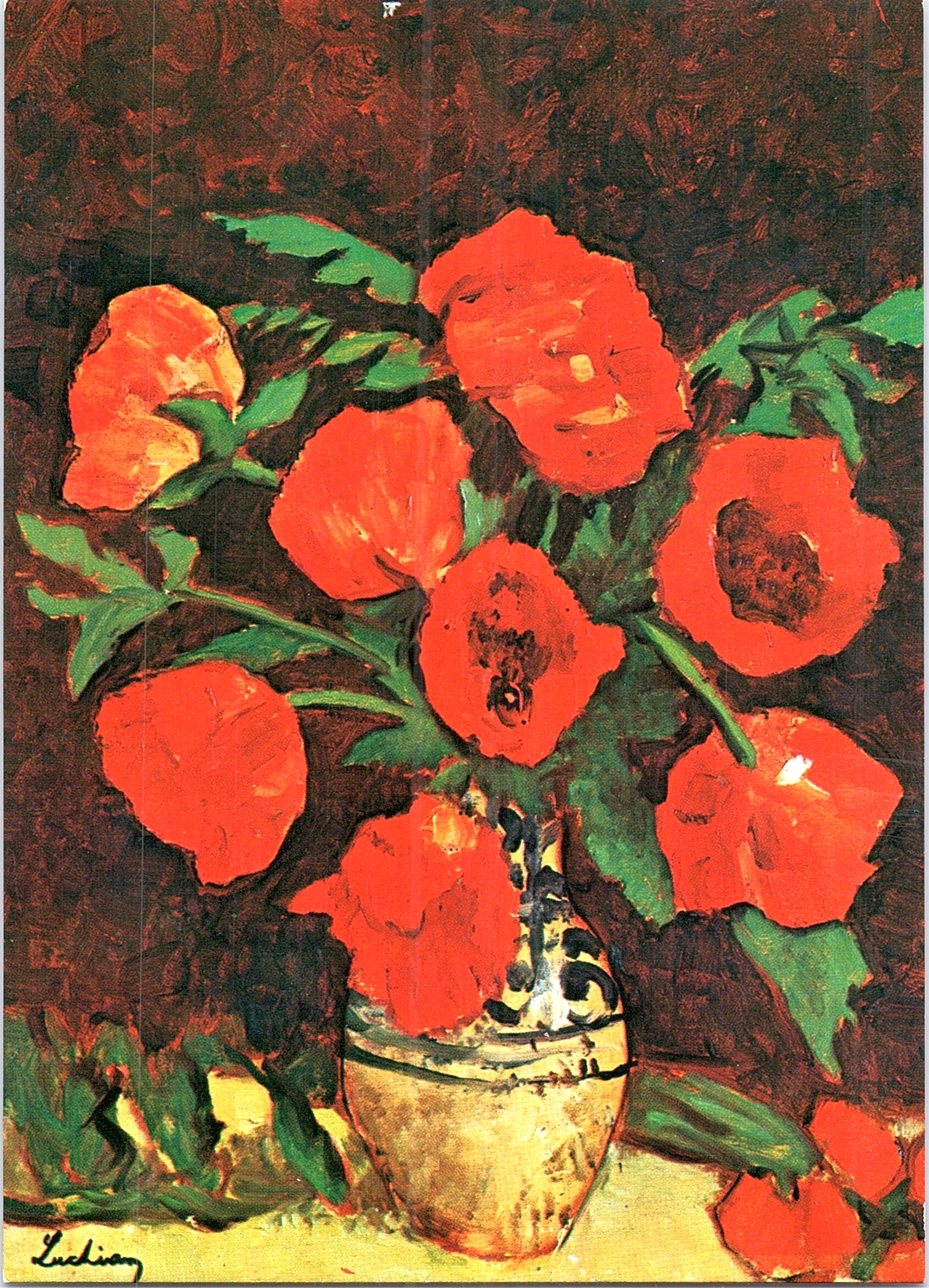 In diesem Werk dominieren kräftige Rottöne, die mit lebhaften Gelb- und Orangetönen kombiniert sind. Diese Farbwahl erzeugt eine intensive, fast leidenschaftliche Stimmung, die den Betrachter sofort in ihren Bann zieht. Das Rot, das den Hintergrund dominiert, vermittelt Wärme und Energie, während die gelben und orangen Blumen eine fröhliche und lebendige Atmosphäre schaffen. Die Wahl dieser Farbpalette trägt auch zur Wahrnehmung von Zeit und Bewegung bei. Die dynamischen Pinselstriche und die lebhaften Farben lassen die Blumen fast lebendig erscheinen, als ob sie in einem ständigen Fluss wären. Diese Bewegung kann den Eindruck erwecken, dass der Moment eingefangen wurde, während die Blumen in voller Blüte stehen. Bestimmte Farben sind mit spezifischen Emotionen und kulturellen Symbolen verbunden. Rot wird oft mit Leidenschaft, Liebe oder sogar Wut assoziiert, während Gelb Freude und Optimismus symbolisiert. Diese emotionale Tiefe beeinflusst die Interpretation des Werkes erheblich. Der Betrachter könnte sich von der Wärme und Vitalität angezogen fühlen, die die Farben ausstrahlen, und gleichzeitig eine tiefere Reflexion über die Vergänglichkeit der Schönheit anregen. Insgesamt schafft die harmonische Kombination dieser Farben eine einladende, aber auch nachdenkliche Atmosphäre, die den Betrachter dazu einlädt, sich mit den dargestellten Emotionen und der vergänglichen Natur des Lebens auseinanderzusetzen.