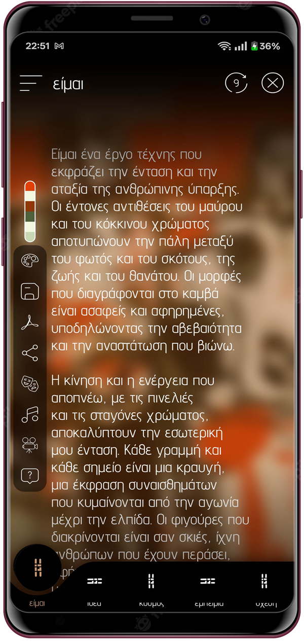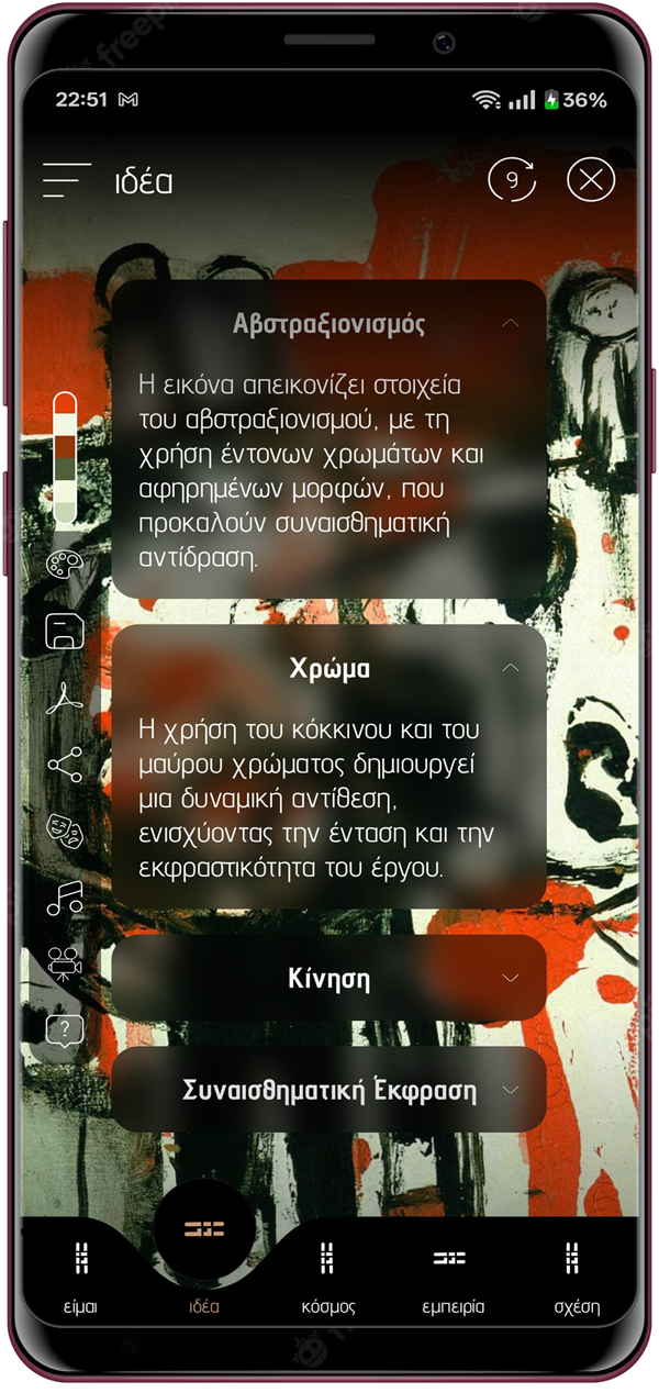 Η εφαρμογή Nema χρησιμοποιεί τεχνητή νοημοσύνη για να «διαβάσει» την εικόνα πέρα από την επιφάνεια. Αναγνωρίζει κυρίαρχα χρώματα, συναισθηματικούς τόνους, συμβολικά στοιχεία και αφηρημένες έννοιες. Το έργο τέχνης μετατρέπεται σε χάρτη νοημάτων — χωρίς να χρειάζεσαι πτυχίο στην ιστορία της τέχνης.