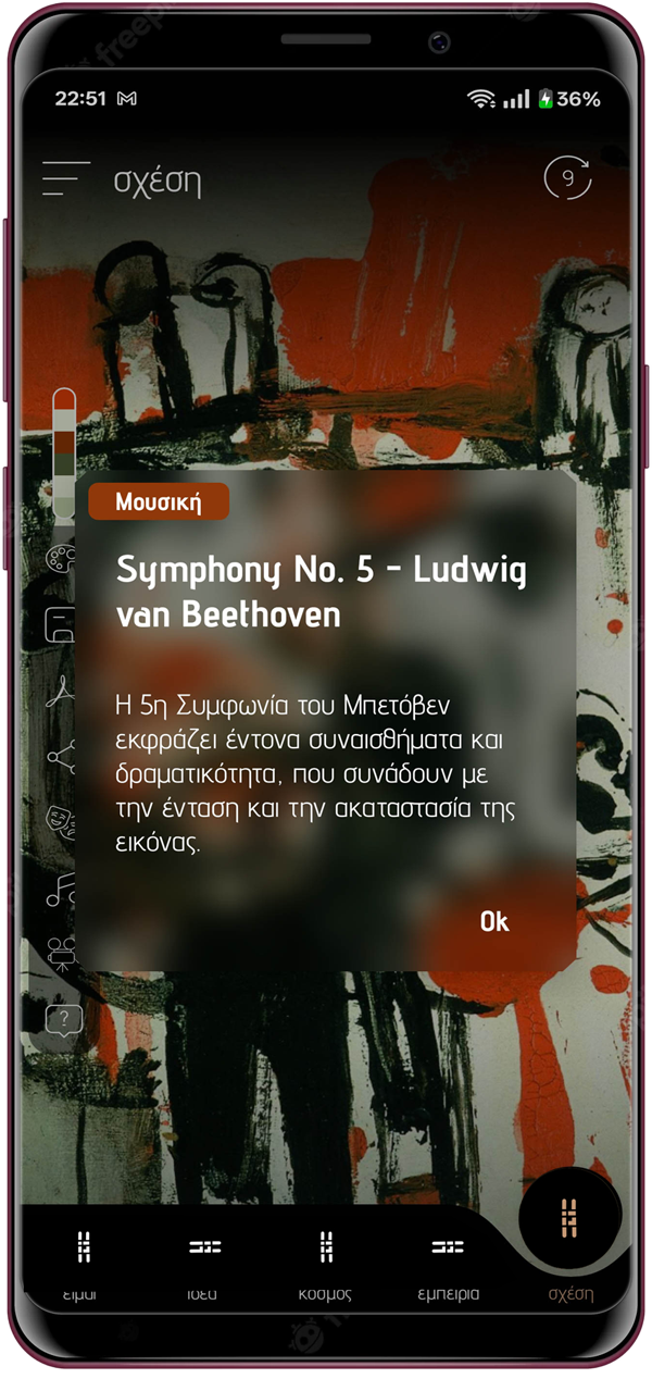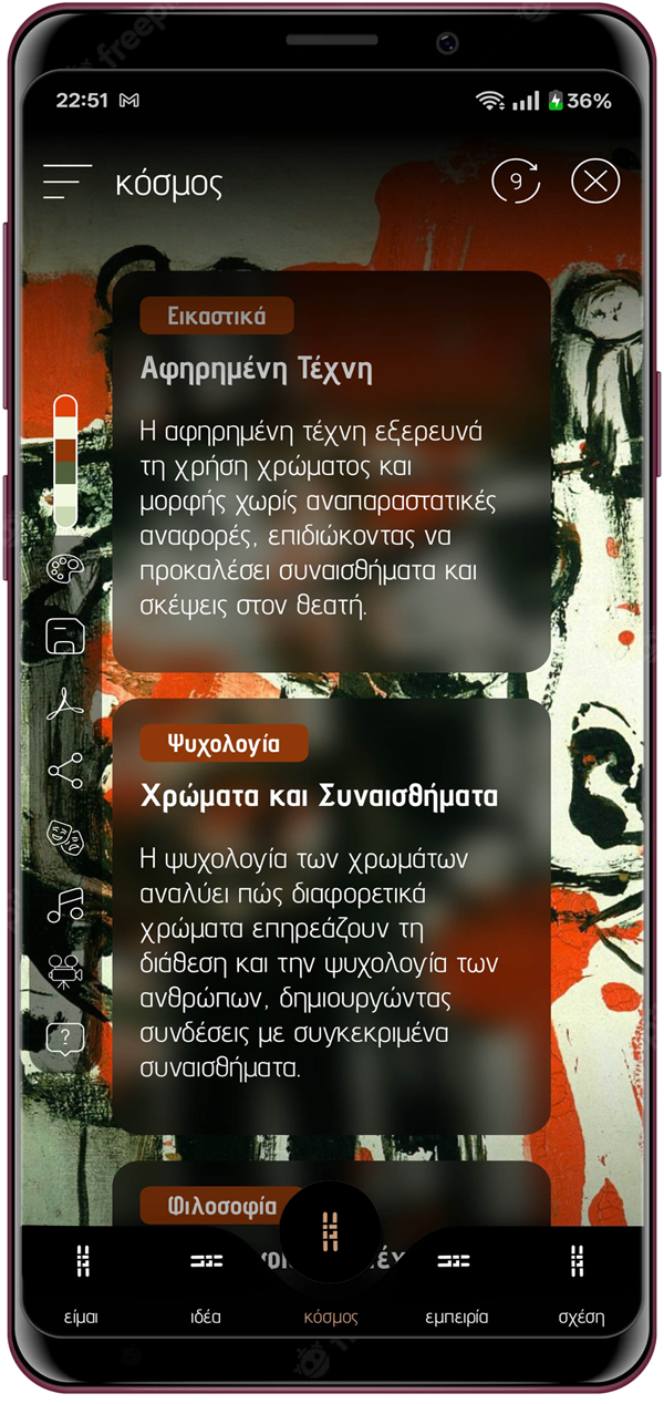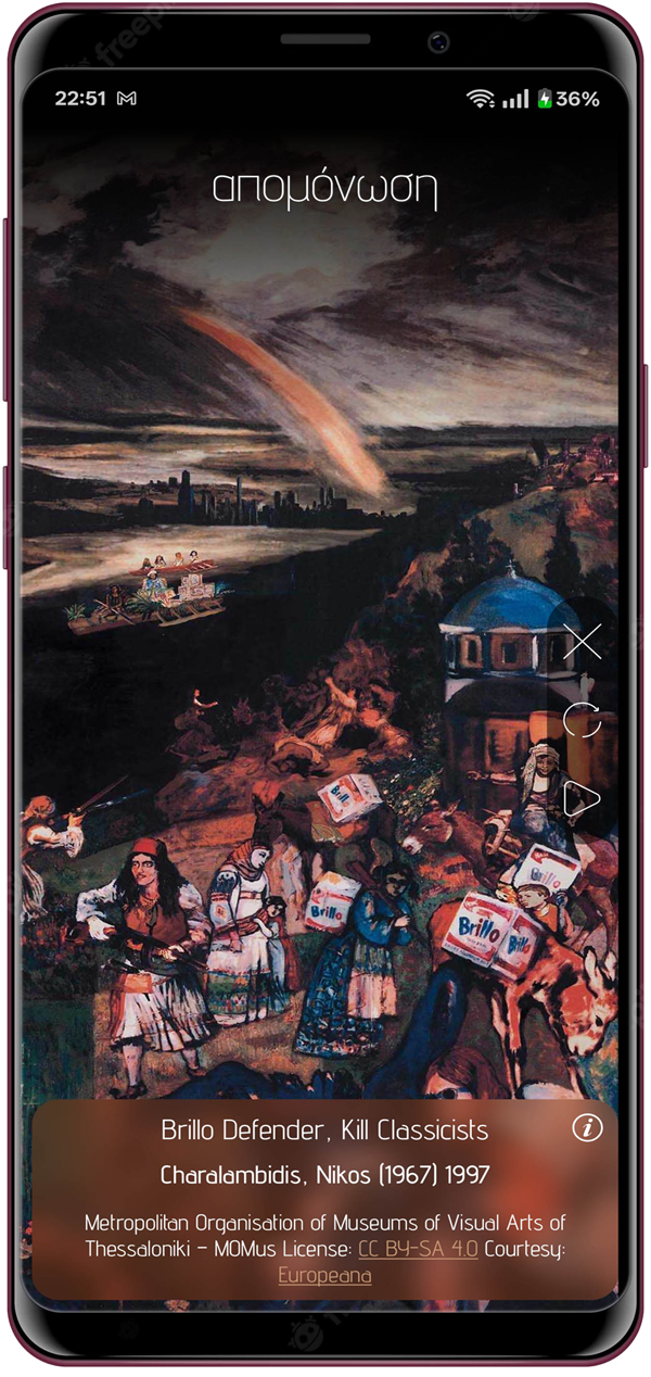 Αυτά τα νήματα μπορεί να αποκαλύψουν χρώματα και διαθέσεις, να συνδέσουν την εικόνα με την επιστήμη, την ψυχολογία, τη μουσική ή να προτείνουν σχετικά έργα από τα τεράστια πολιτιστικά αρχεία της Ευρώπης. Αυτό που λαμβάνετε δεν είναι μια διάλεξη, αλλά ένας καθρέφτης – μια μοναδική αντανάκλαση που διαμορφώνεται από την αλληλεπίδρασή σας με την εικόνα.