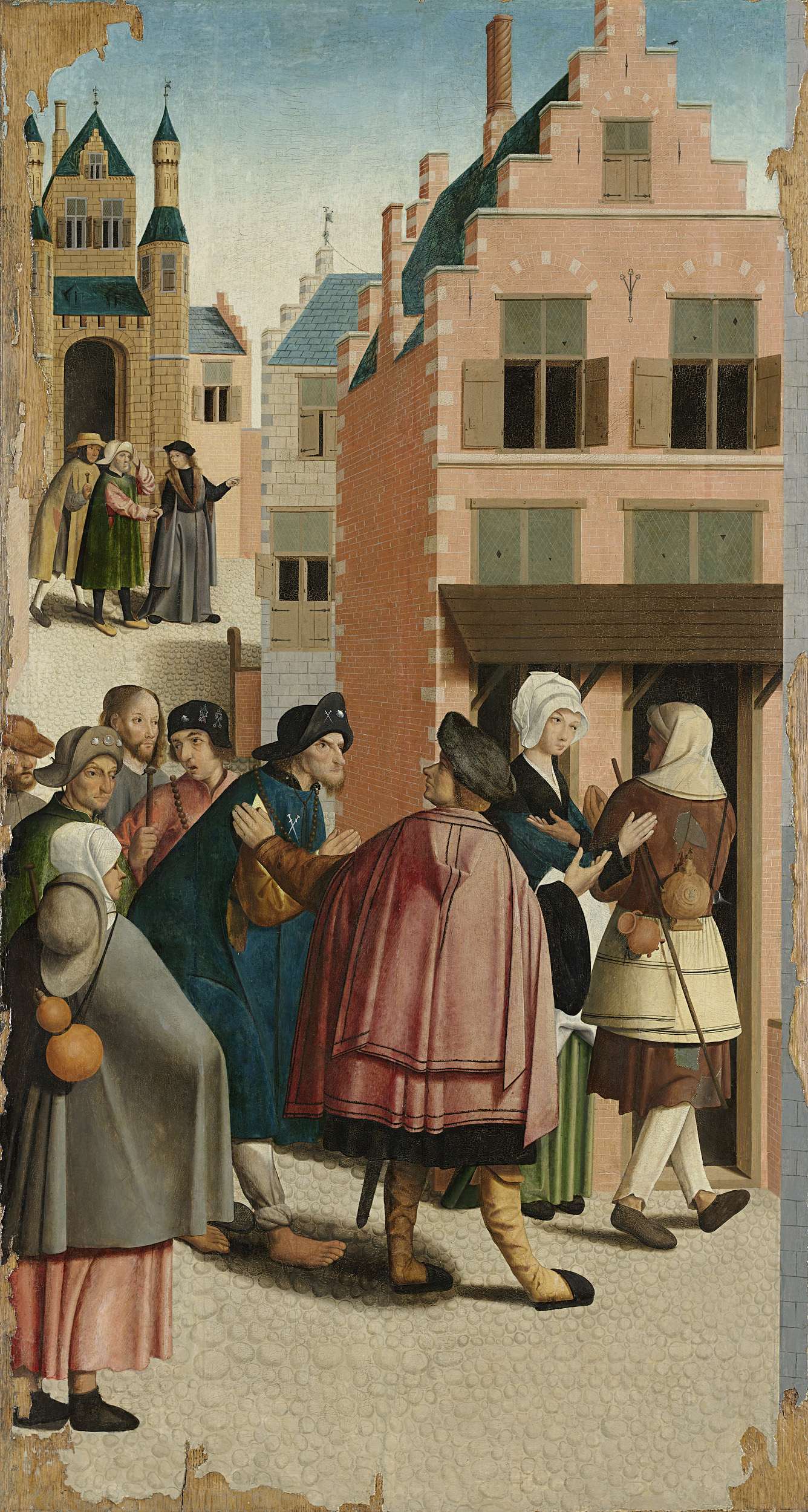 Η σκηνή απεικονίζει μια αγορά, όπου οι άνθρωποι αλληλεπιδρούν και ανταλλάσσουν αγαθά. Η αγορά είναι κεντρικό σημείο κοινωνικής και οικονομικής δραστηριότητας στην καθημερινή ζωή.