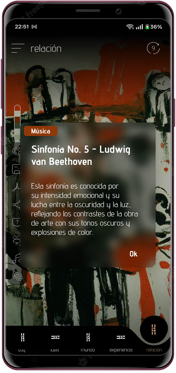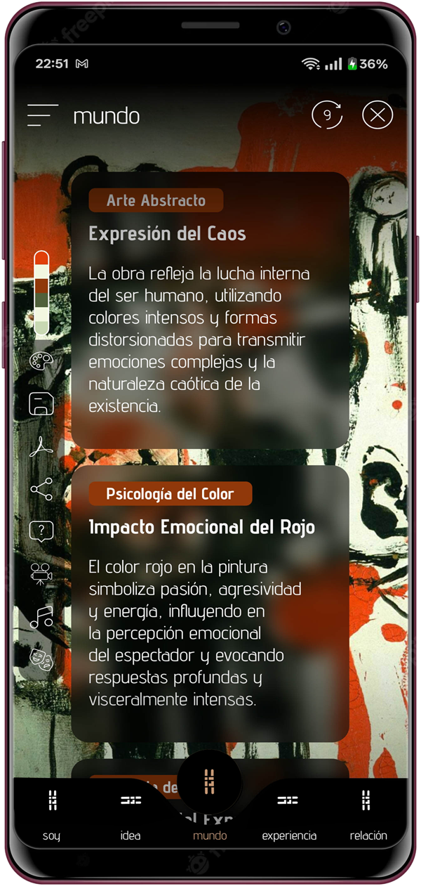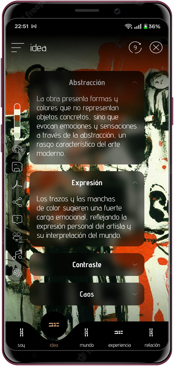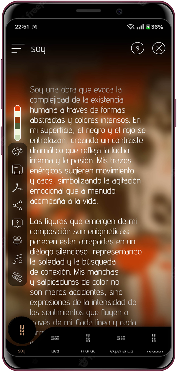 La aplicación Nema utiliza inteligencia artificial para leer la imagen más allá de su apariencia. Identifica colores dominantes, tonos emocionales, elementos simbólicos y conceptos subyacentes. La obra se convierte en un mapa de significados — sin necesidad de tener estudios en historia del arte.