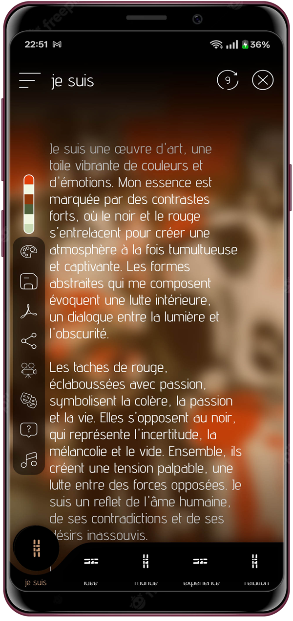 Sauvegarde tes fils comme une collection personnelle ou partage-les avec ta communauté. Chaque interaction devient une expression unique — une nouvelle couche de sens tissée entre toi et l’œuvre. Reviens quand tu veux pour voir comment ta perception évolue.