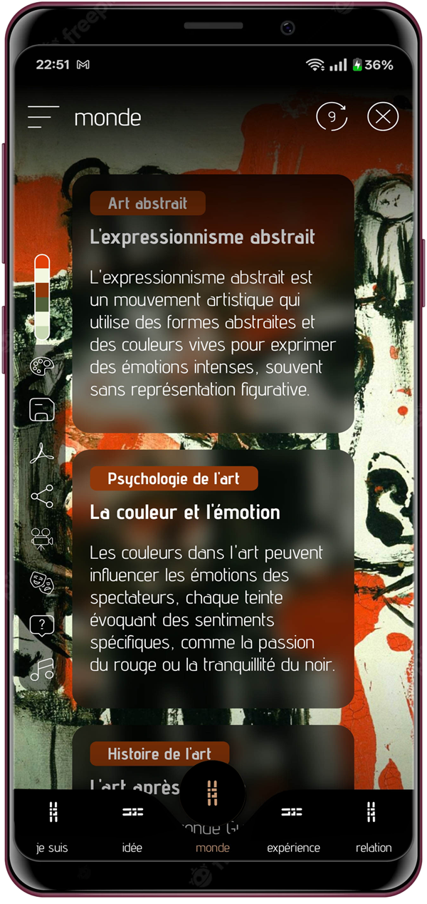 Ces fils peuvent révéler des couleurs et des ambiances, relier l’image à la science, la psychologie ou la musique, ou encore suggérer des œuvres associées issues des riches archives culturelles européennes. Ce que tu reçois n’est pas une leçon, mais un miroir — un reflet unique façonné par ton interaction avec l’image.