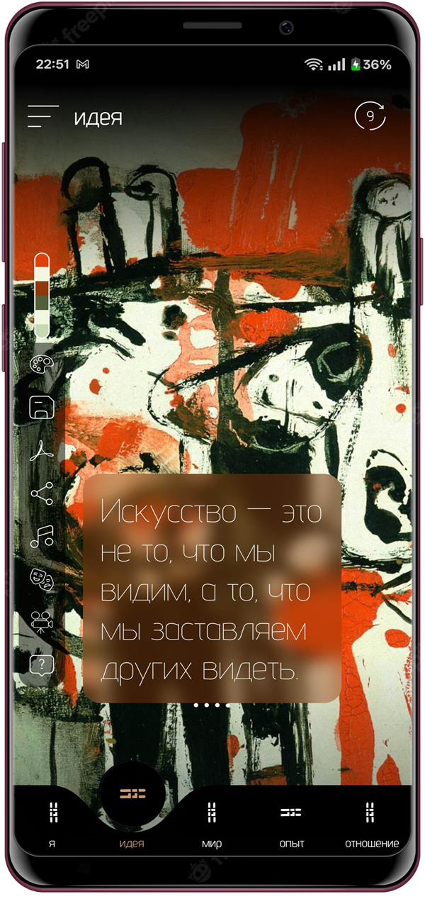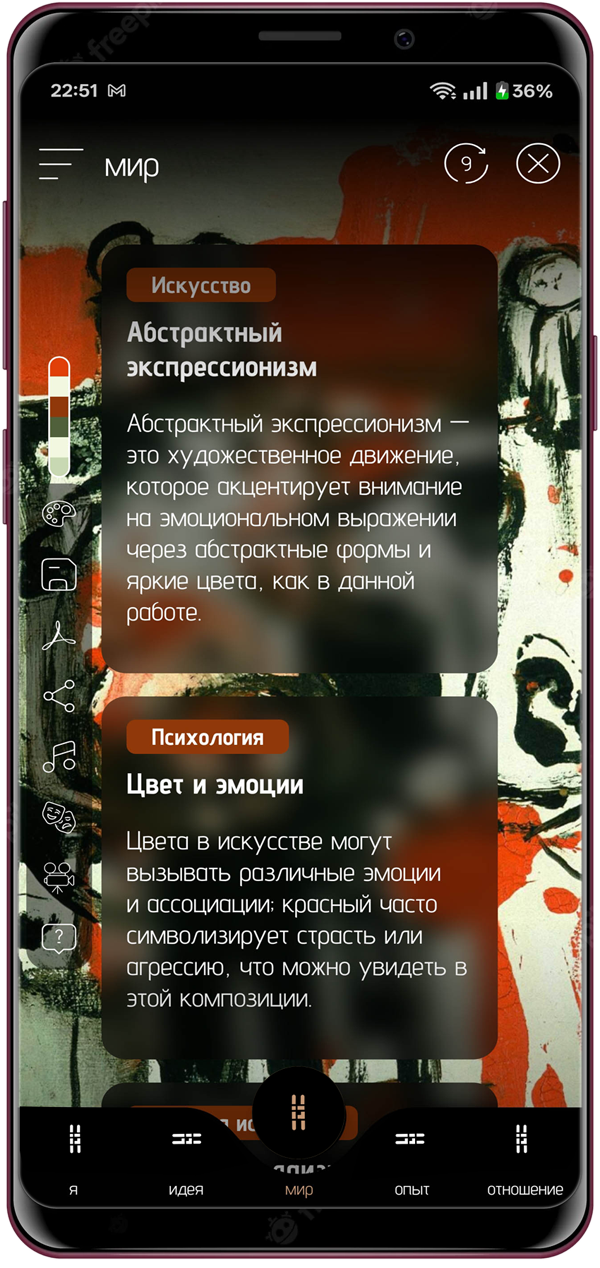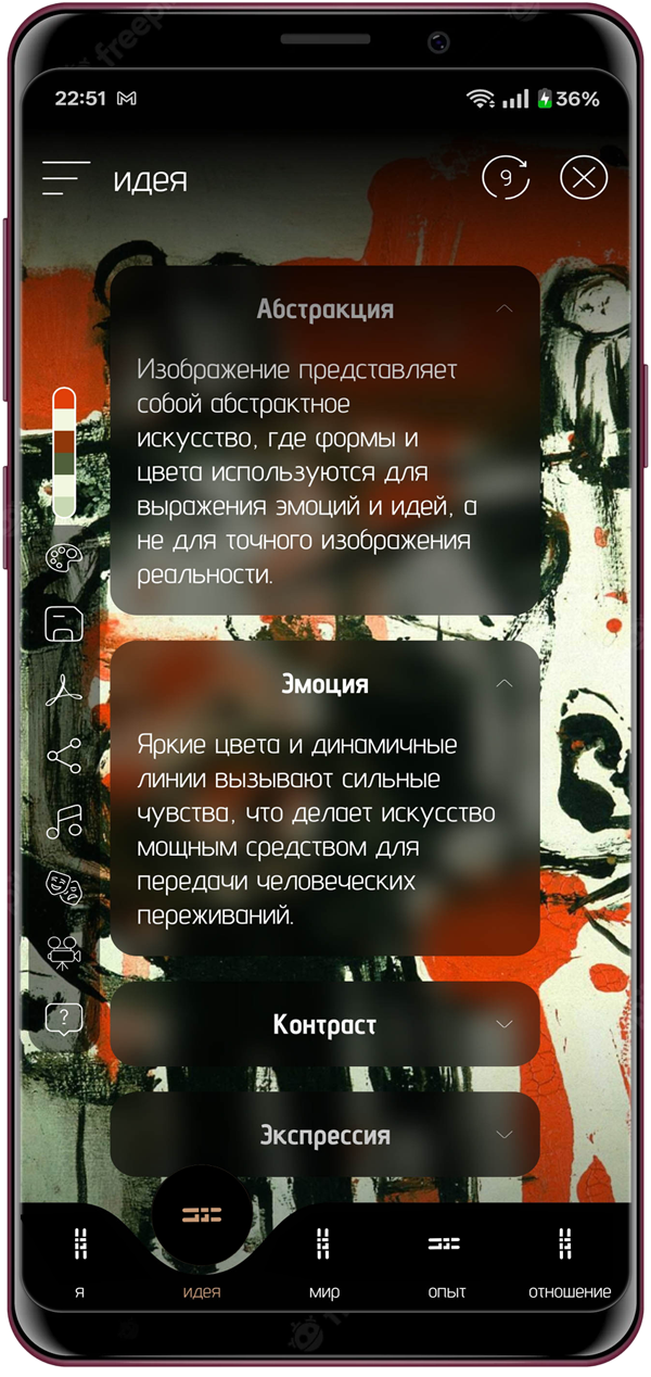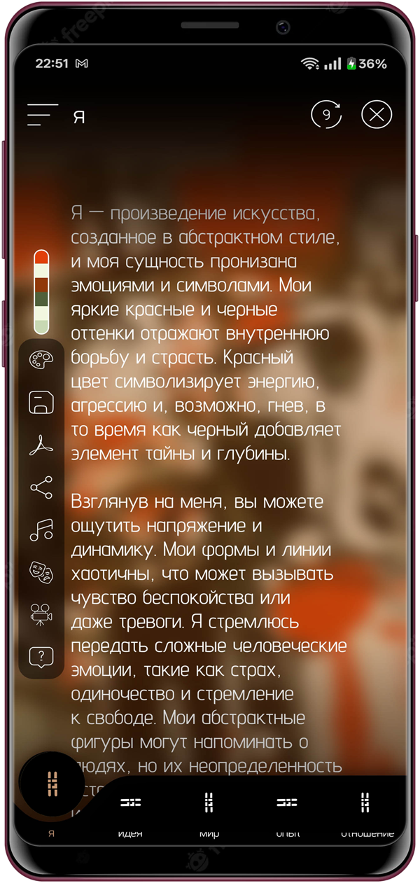 Приложение Nema — это мобильное приложение, которое переосмысливает наш опыт взаимодействия с искусством. Вместо того чтобы предлагать готовые интерпретации или академические комментарии, оно приглашает тебя исследовать личные, эмоциональные и интеллектуальные связи с любым произведением. Просто загрузи или сфотографируй изображение — и ты откроешь сеть значений, или «нити», созданные на основе анализа с использованием искусственного интеллекта.